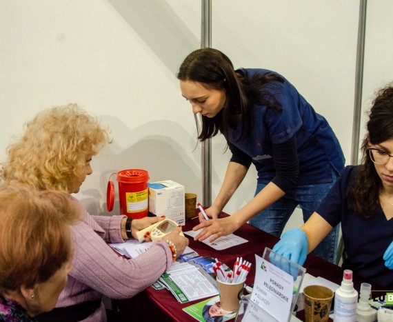 Na parterze hali odwiedzających witają stoiska oferujące konsultacje medyczne, porady specjalistów oraz diagnostykę. Sprawdzić swoje zdrowie można dzięki bezpłatnym badaniom profilaktycznym, laboratoryjnym, pomiarowi ciśnienia, czy poziomu cukru. Dla dbających o sylwetkę jest dietetyk kliniczny, a Kuźnia Zdrowia przygotowała konsultację z dietetykiem obejmująca również pomiar ilości tkanki tłuszczowej, mięśniowej, poziom wody w organizmie czy wiek metaboliczny. Można również zamówić catering dietetyczny, tzw. dietę pudełkową.